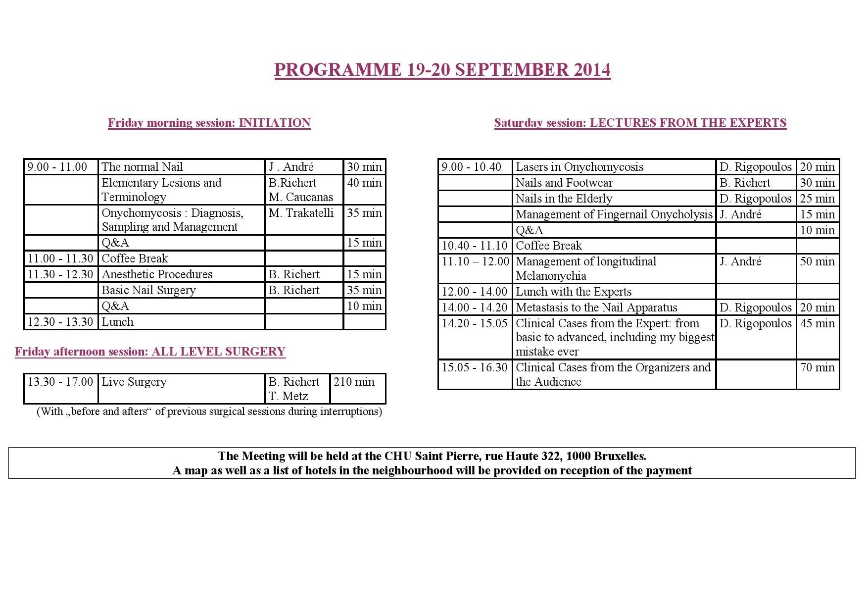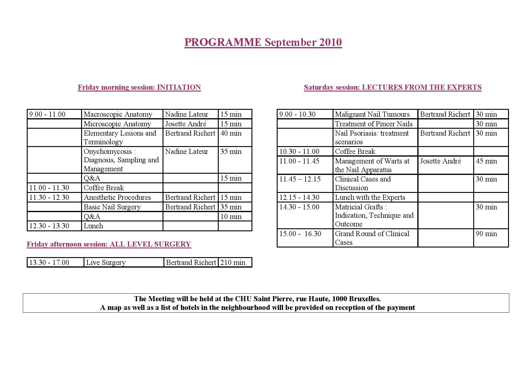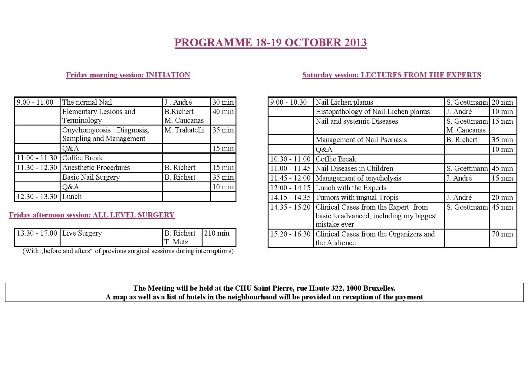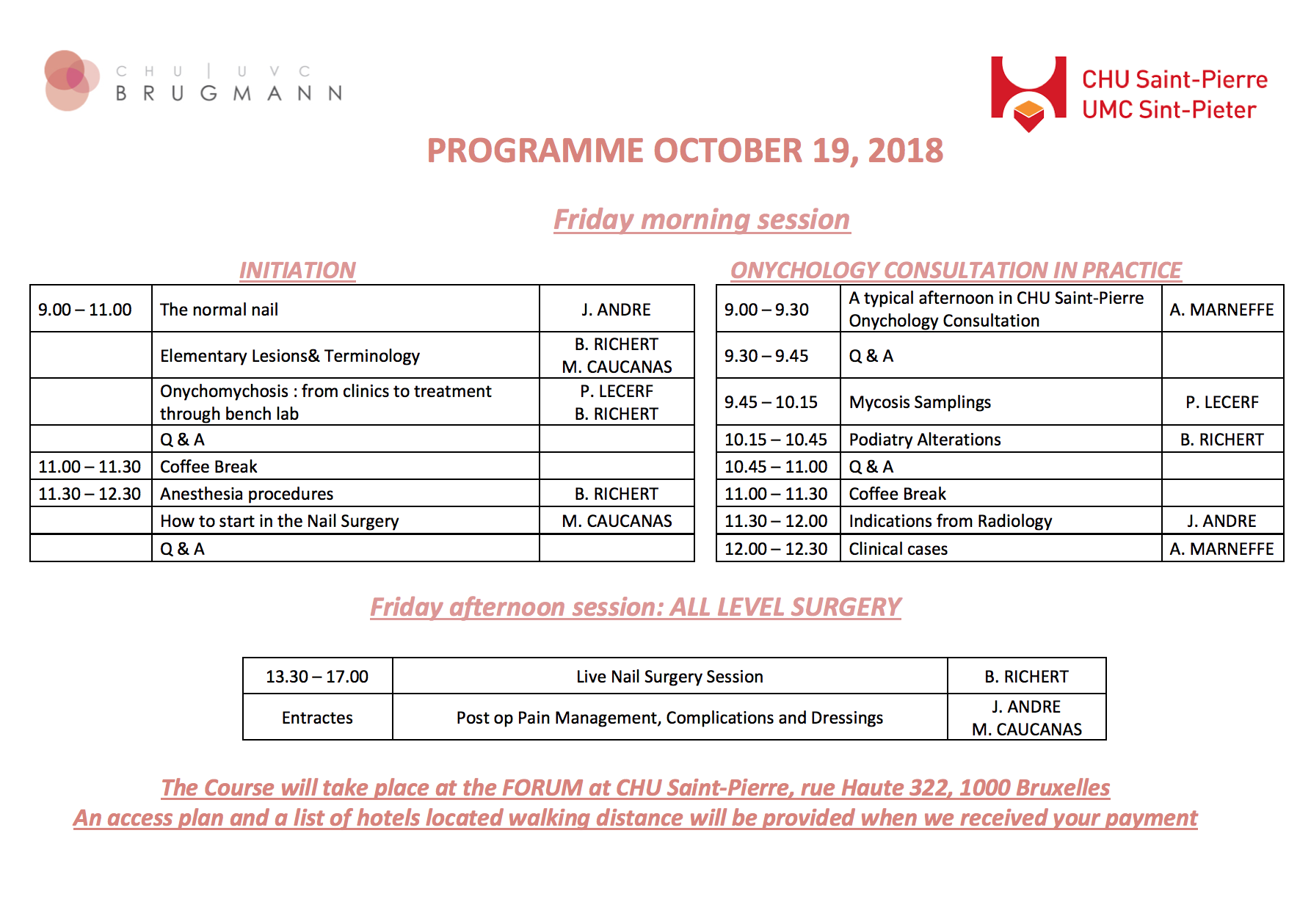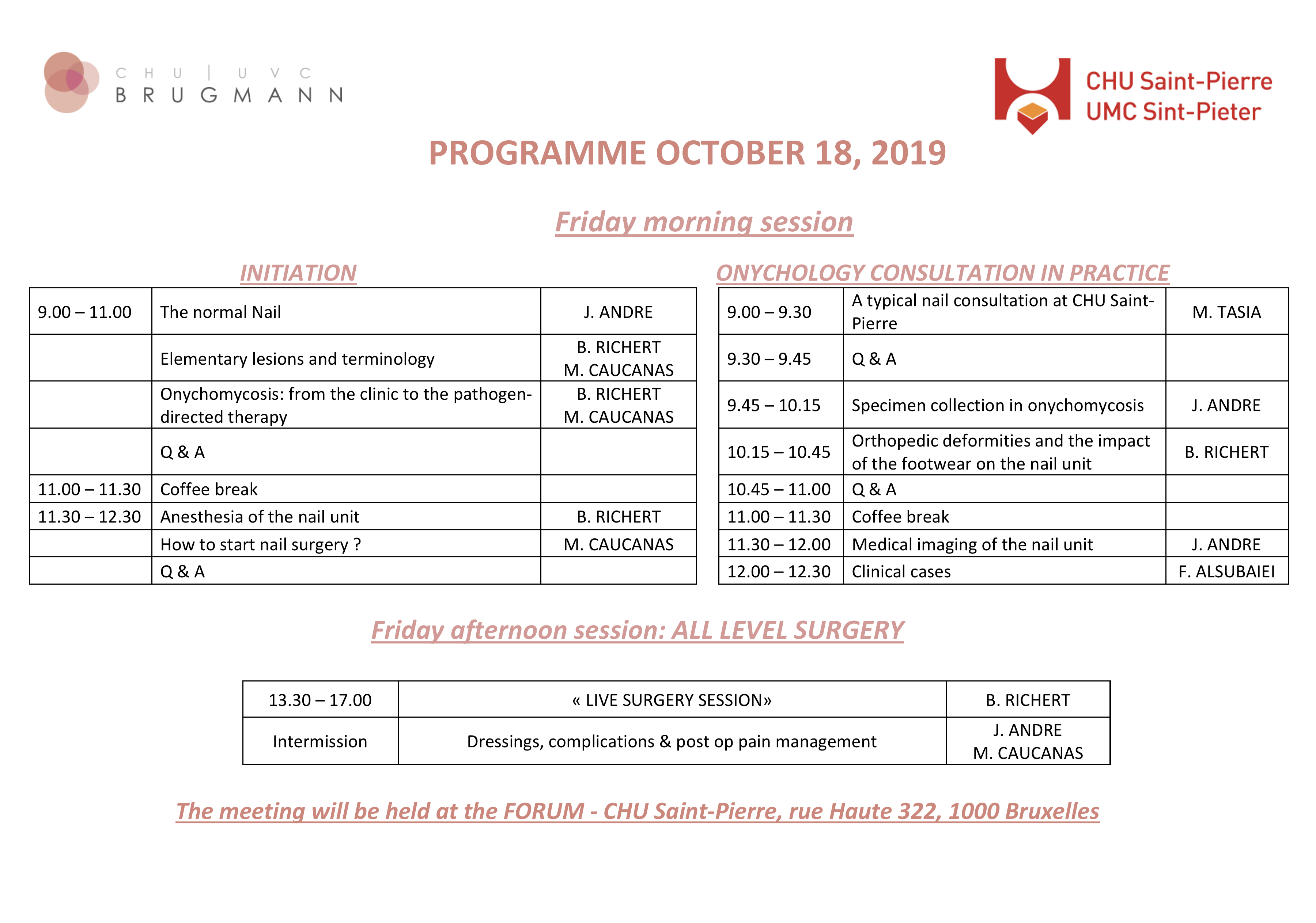 Friday afternoon is devoted to nail surgery on a large screen, live from the operating room. The audience may at any time intervene and ask questions to the surgeon or even to the patient.